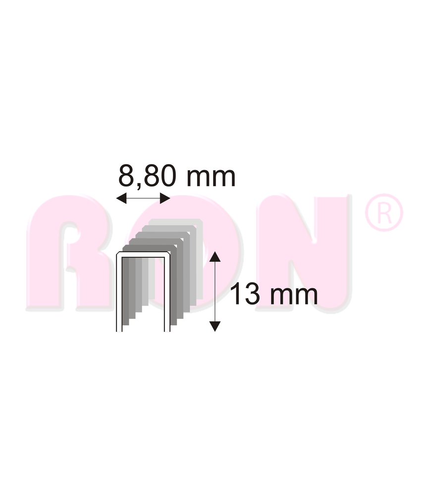 Truhlářské spony, sponky pro pneumatické sponkovačky. Spojovače široké 8,8 mm, silné 1,28 mm a dlouhé s ostřeným hrotem 13 mm.