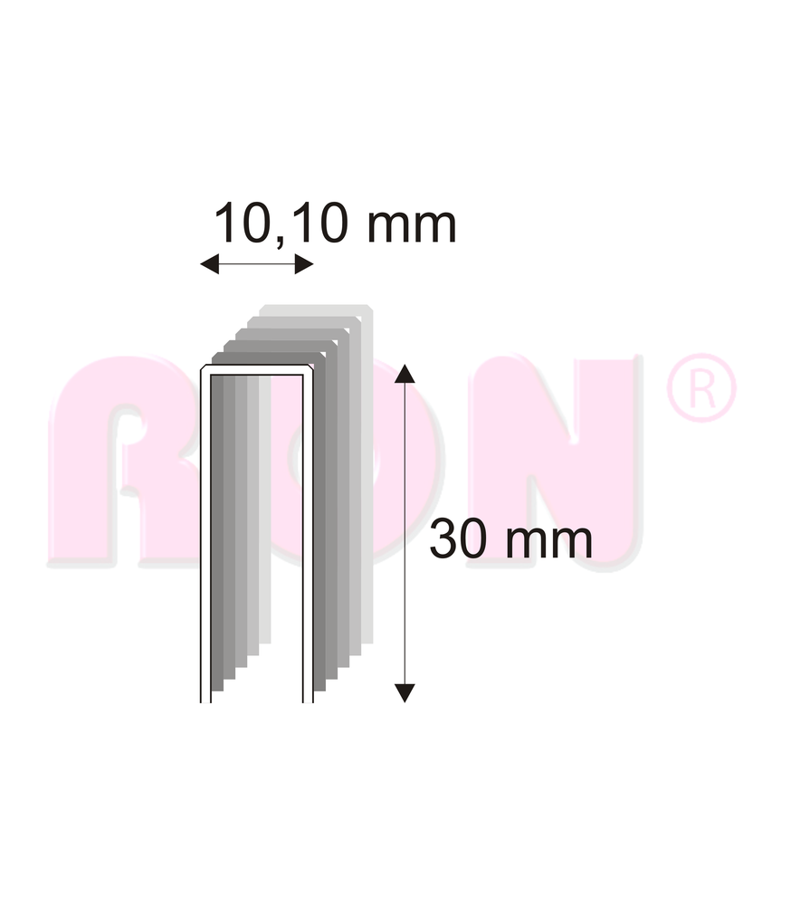Truhlářské spony, sponky pro pneumatické sponkovačky. Spojovače široké 10,1 mm, silné 1,27 mm a dlouhé 30 mm.