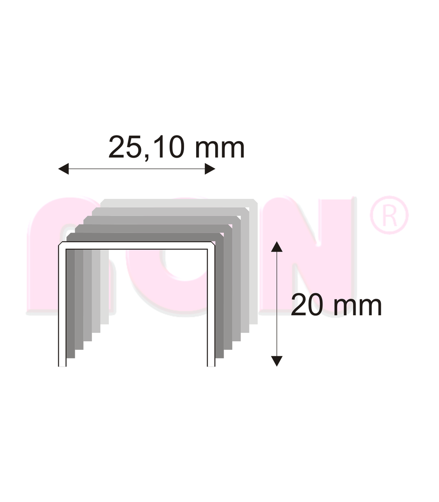 Kartonážní široké spony, sponky pro pneumatické sponkovačky. Spojovače široké 25,1 mm, silné 1,63 mm a dlouhé 20 mm.