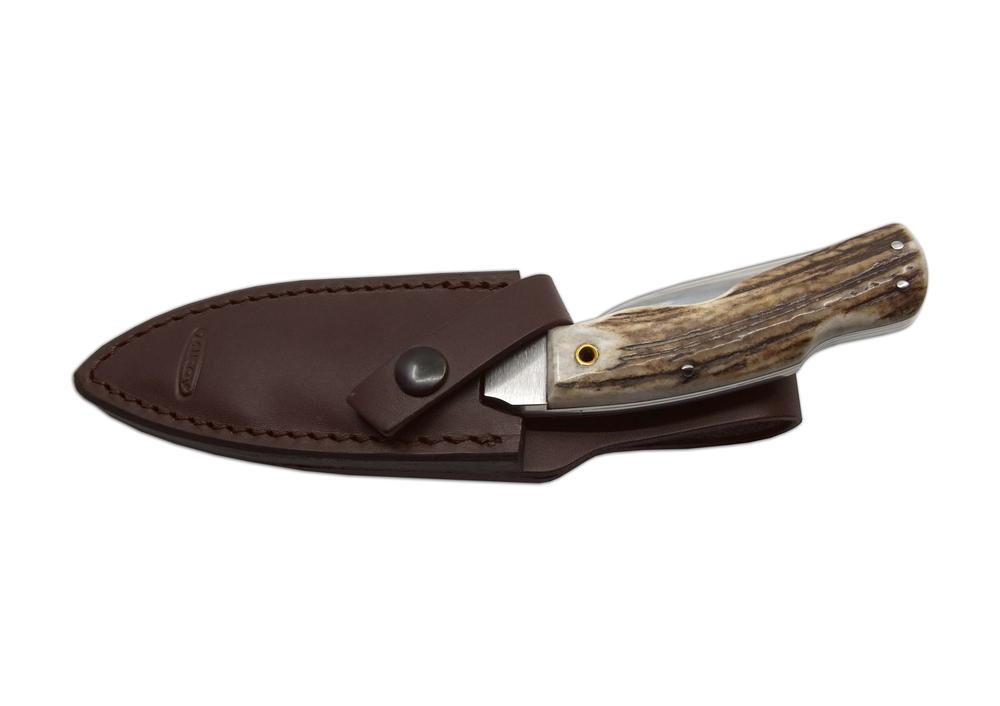 materiál čepele: nerezová ocel 420 materiál střenky: jelení paroh váha nože včetně pouzdra 278 g