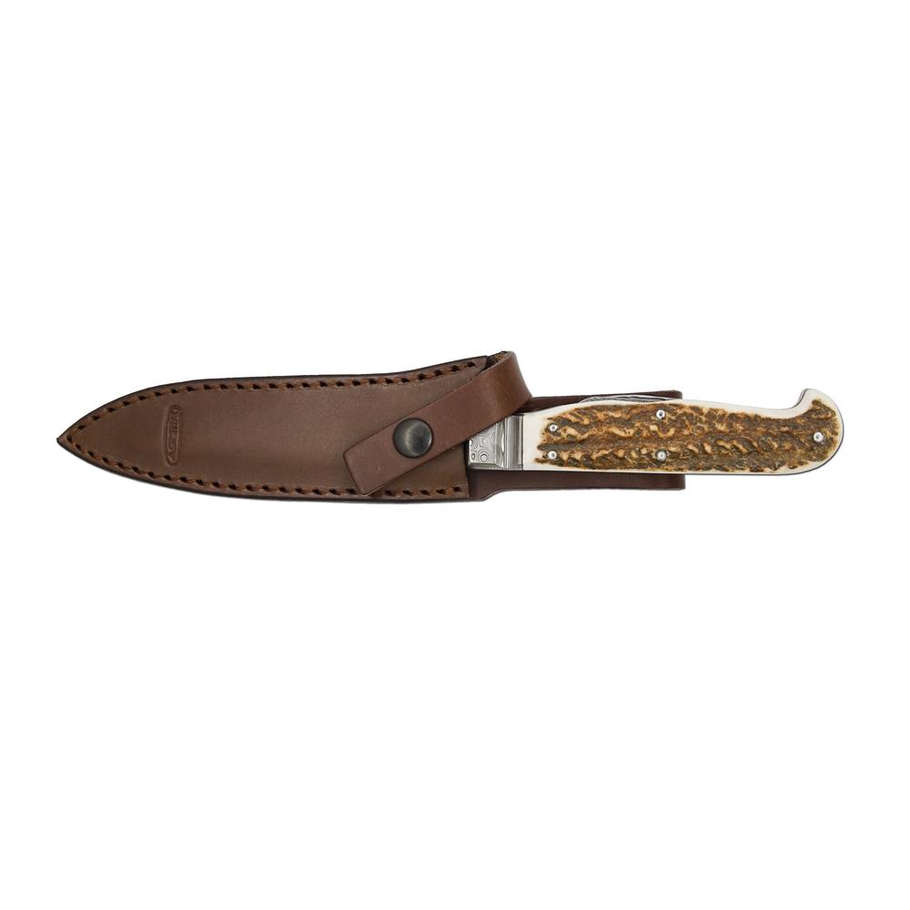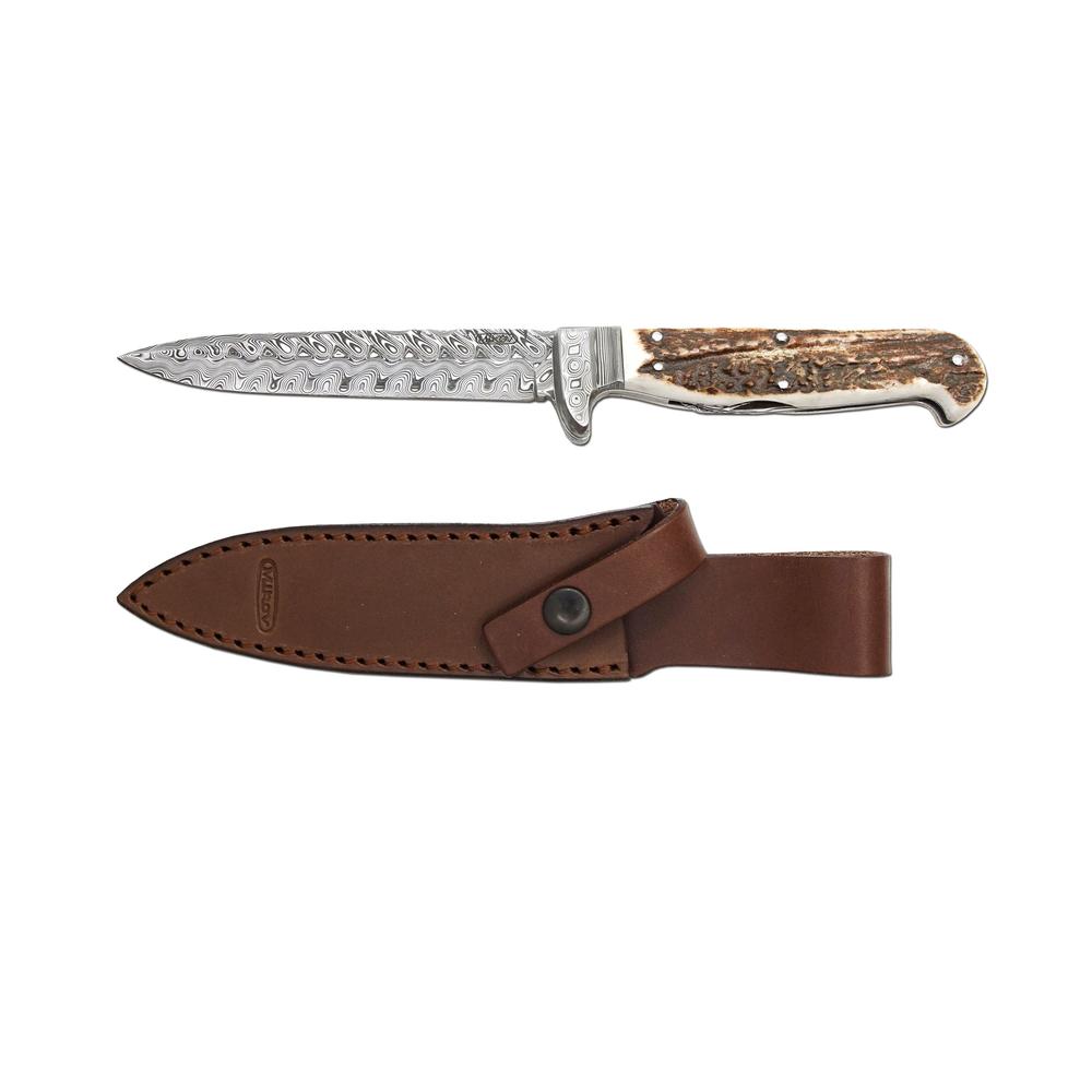 Dýka 370-DP-3 JELENÁŘSKÁ Lovecká dýka s pevnou čepelí s názvem JELEN je oblíbeným nožem pro lovce, kteří mají rádi kvalitní nůž, na který se mohou spolehnout. Čepel je ve tvaru zavazáku (nůž na zápich) a je vyrobena z damaškové oceli s tvrdostí 57-60 HRc. Držadlo dýky, které v sobě skrývá pilku a párák je vyrobeno z pravého parohu Dýka je standardně dodávána s koženým pouzdrem. Lovecký nůž je vhodný pro lovecké, tábornické potřeby, řezání kostí nebo párání kůže zvěře. Lovecký nůž JELEN patří mezi originální nože firmy Mikov s.r.o. Mikulášovice.