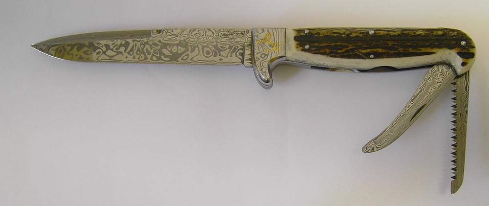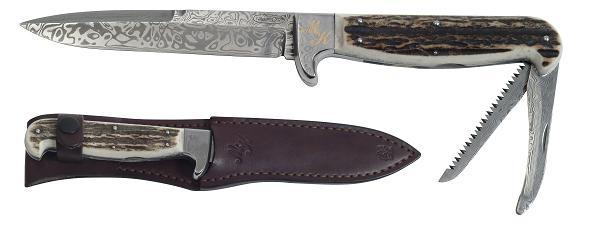 Dýka 370-DP-3 JELENÁŘSKÁ Lovecká dýka s pevnou čepelí s názvem JELEN je oblíbeným nožem pro lovce, kteří mají rádi kvalitní nůž, na který se mohou spolehnout. Čepel je ve tvaru zavazáku (nůž na zápich) a je vyrobena z damaškové oceli s tvrdostí 57-60 HRc. Držadlo dýky, které v sobě skrývá pilku a párák je vyrobeno z pravého parohu Dýka je standardně dodávána s koženým pouzdrem. Lovecký nůž je vhodný pro lovecké, tábornické potřeby, řezání kostí nebo párání kůže zvěře. Lovecký nůž JELEN patří mezi originální nože firmy Mikov s.r.o. Mikulášovice.