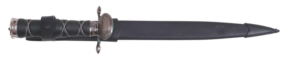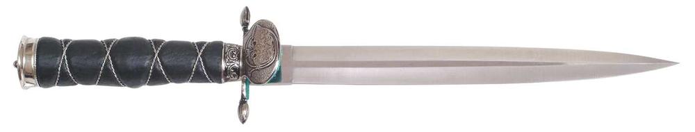 Dýka MEČÍK 700-NK-24 DEKORATIVNÍ Lovecká dýka s názvem CAESAR slouží jako pasovací mečík pro nové členy mysliveckých a loveckých spolků. Vyrobena je z kvalitní nerezové oceli typ 420 s tvrdostí 52-55HRc a střenka je potažena pravou kůží. Záštita, zadní kování a střenka jsou bohatě zdobeny. Dýka je standardně dodávána s koženým pouzdrem. Lovecká dýka s názvem CAESAR patří k originálním nožům firmy Mikov s.r.o. Mikulášovice.