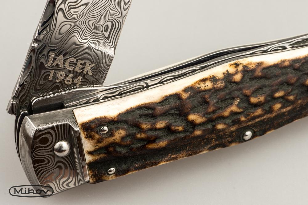 Vyhazovací nůž PREDATOR VYBAVENÍ: čepel, pilka Special: - nůž má čepel z damaškové oceli PMC 27 - střenka nože je z jeleního parohu a má ergonomický tvar perfektně padnoucí do ruky - nůž je dodáván včetně luxusního koženého pouzdra - nůž je možné na přání vyrobit i v levorukém provedení (bez příplatku)