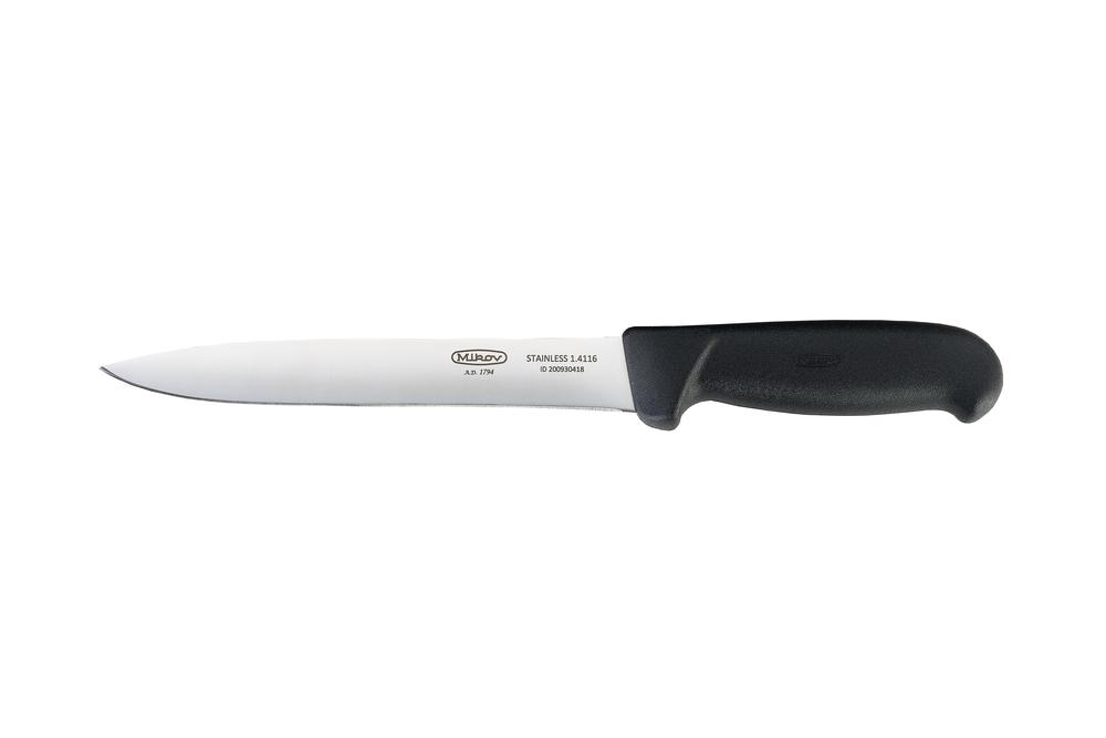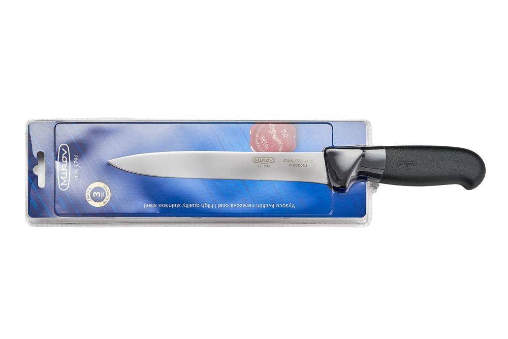 Kvalitní čepel s logem Mikov je vyrobena z kvalitní nerezové oceli 1.4116 (440A) o tvrdosti 55 – 58 HRc s vysokou řezivostí a otěruvzdorností osvědčenou pro výrobu řeznických a kuchyňských nožů. Je zasazena do plastové rukojeti, jejíž ergonomie umožňuje bezpečný a pohodlný úchop všemi prsty.
