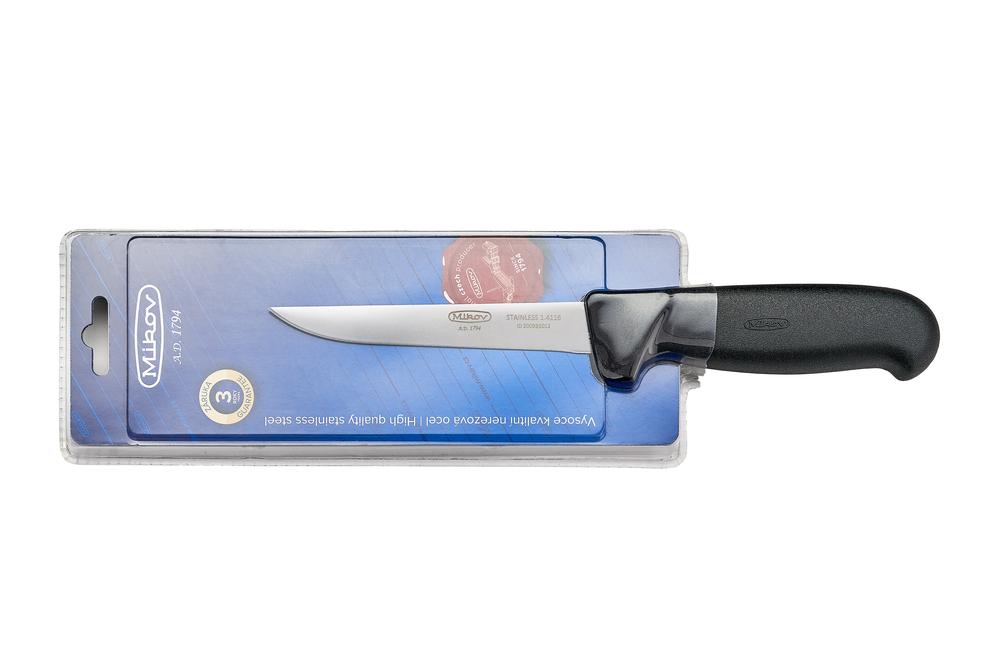 Kvalitní čepel s logem Mikov je vyrobena z kvalitní nerezové oceli 1.4116 (440A) o tvrdosti 55 – 58 HRc s vysokou řezivostí a otěruvzdorností osvědčenou pro výrobu řeznických a kuchyňských nožů. Je zasazena do plastové rukojeti, jejíž ergonomie umožňuje bezpečný a pohodlný úchop všemi prsty.