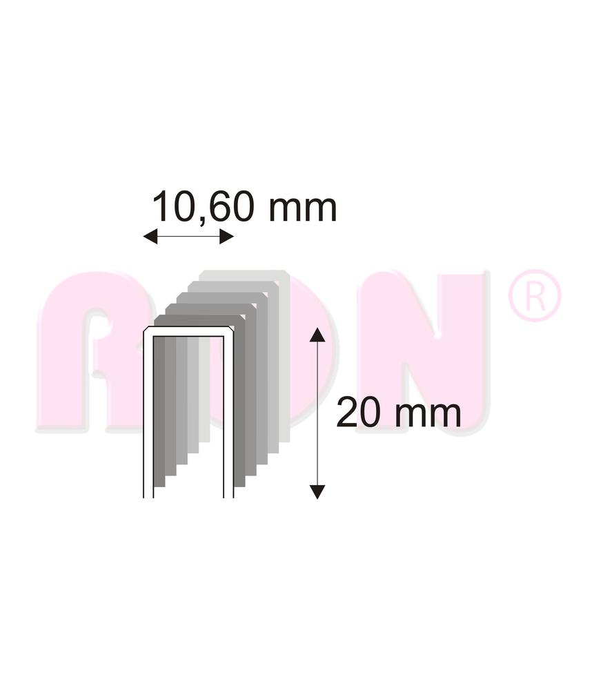 Truhlářské a tesařské spony, sponky pro pneumatické sponkovačky. Spojovače široké 10,6 mm, silné 1,45 mm a dlouhé 20 mm.