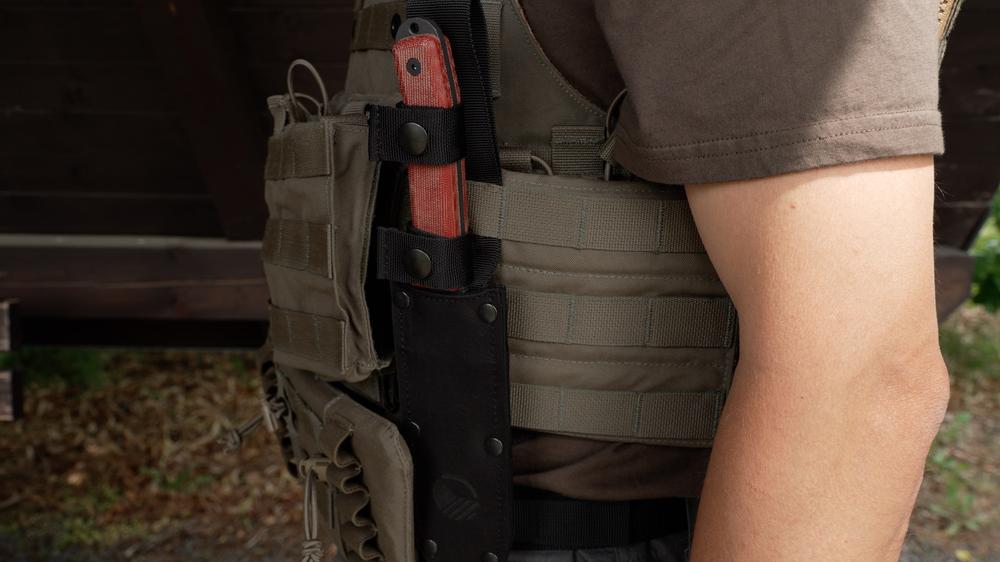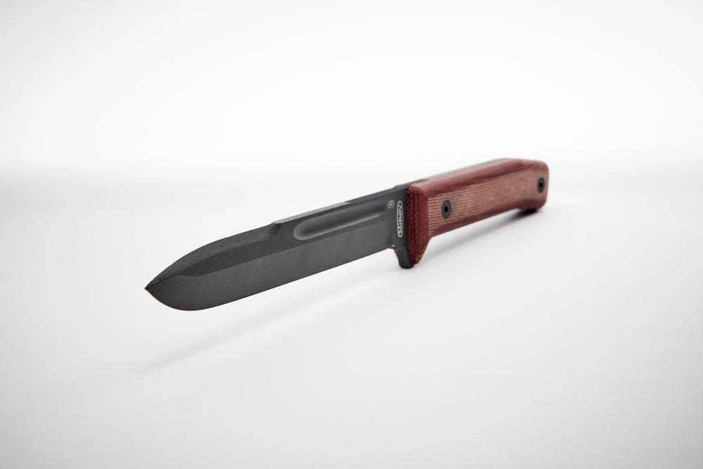 Ocel použitá na výrobu nože: N 690 - 58-60 HRc Celková délka nože: 275 mm Délka nože s pouzdrem: 320 mm Délka čepele: 149 mm Šířka čepele: 24 mm Tloušťka čepele: 4,9 mm Povrchová úprava čepele: Ceracote cobalt Materiál střenek: Micarta červená