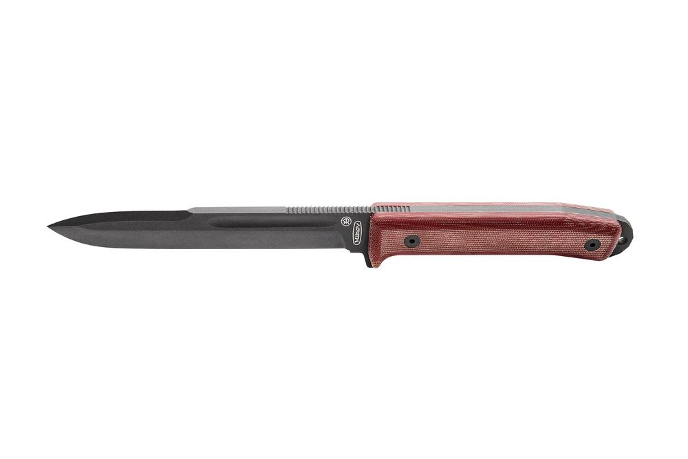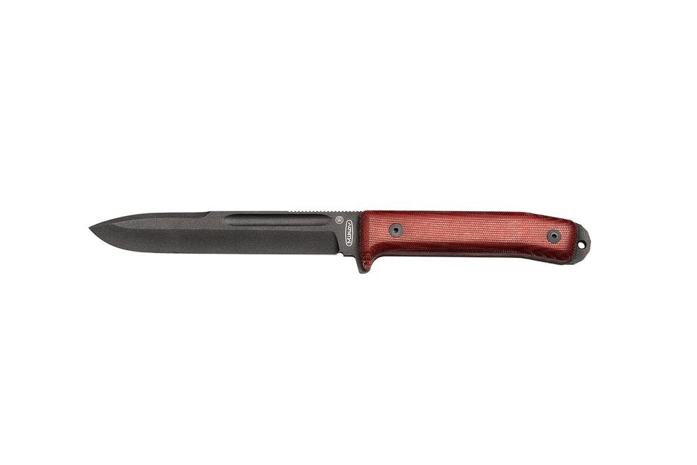 Ocel použitá na výrobu nože: N 690 - 58-60 HRc Celková délka nože: 275 mm Délka nože s pouzdrem: 320 mm Délka čepele: 149 mm Šířka čepele: 24 mm Tloušťka čepele: 4,9 mm Povrchová úprava čepele: Ceracote cobalt Materiál střenek: Micarta červená