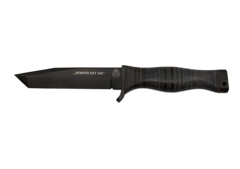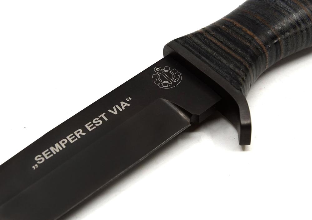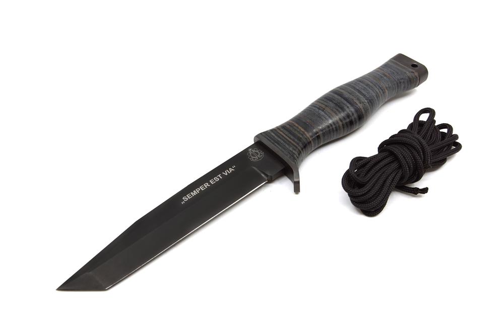 Nůž má čepel vyrobenou z oceli Bőhler N690, která patří mezi významné nožířské oceli s velkou řezivostí a odolností proti poškození i korozi. Garantovaná tvrdost je 57-60 HRc. Držadlo je tvořeno z kroužků černé kůže.
